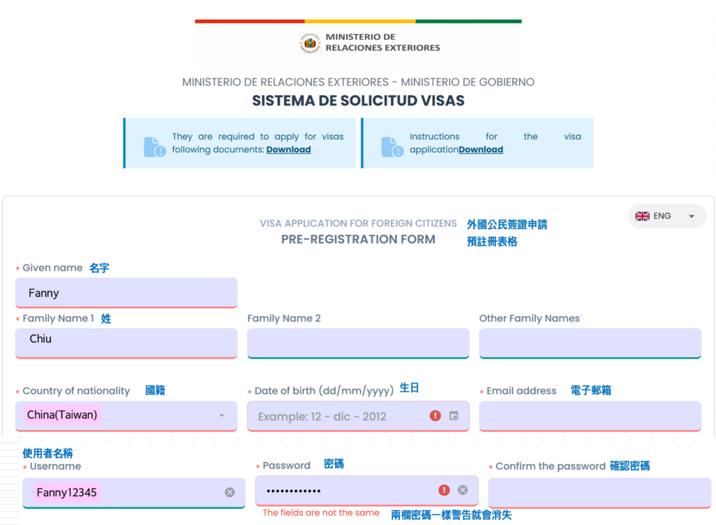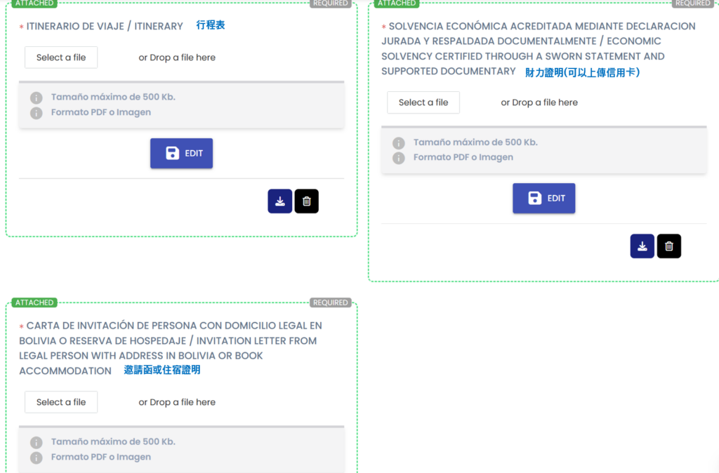 玻利維亞官網系統極其挑剔,請務必先將所有檔案縮小至 500KB 以下(大頭照需 150KB 以下),且檔名僅限英文與數字。