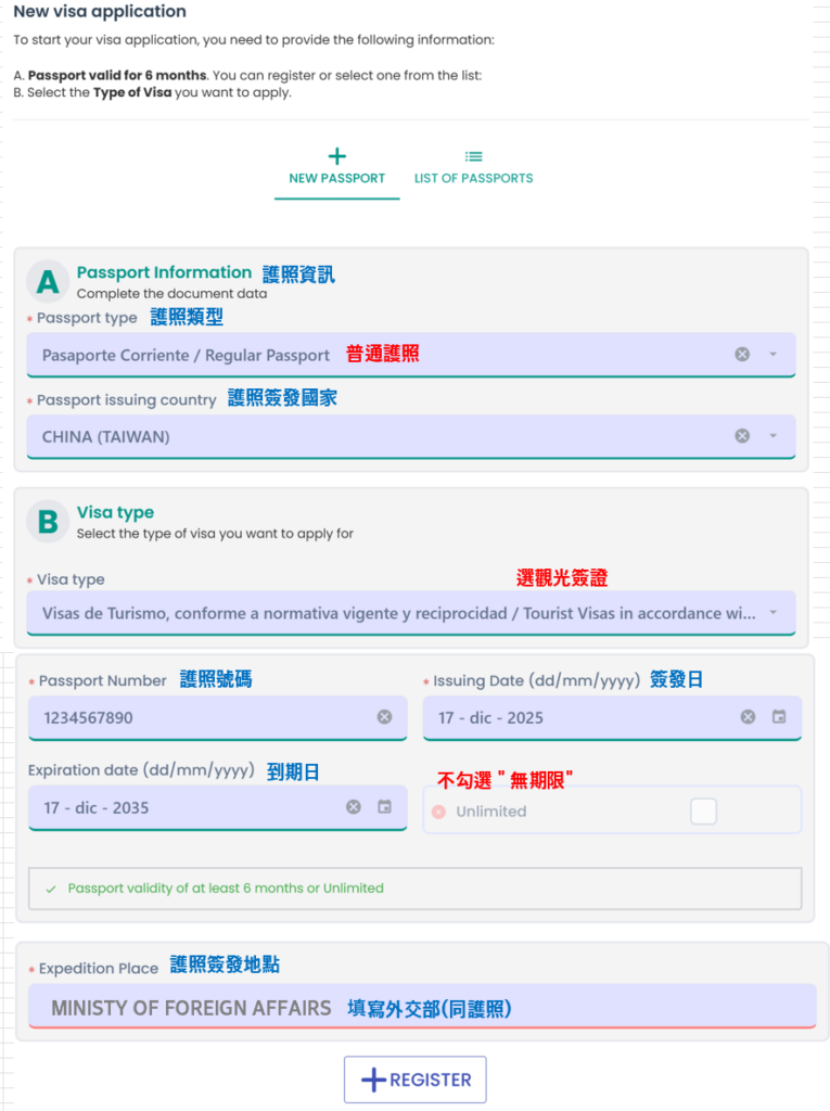 - 簽證類型 (Tipo):VISAS DE TURISMO (旅遊簽證),並註明是依據現行法規與互惠原則核發
