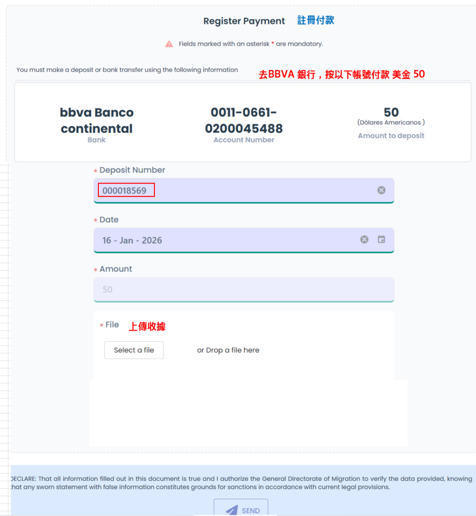 拿回收據後,回系統填入 Deposit Number (CLAVE) 並上傳收據照片