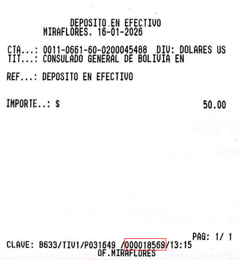 繳費與回填:依系統指示去 BBVA/BCP 銀行 存入美金50