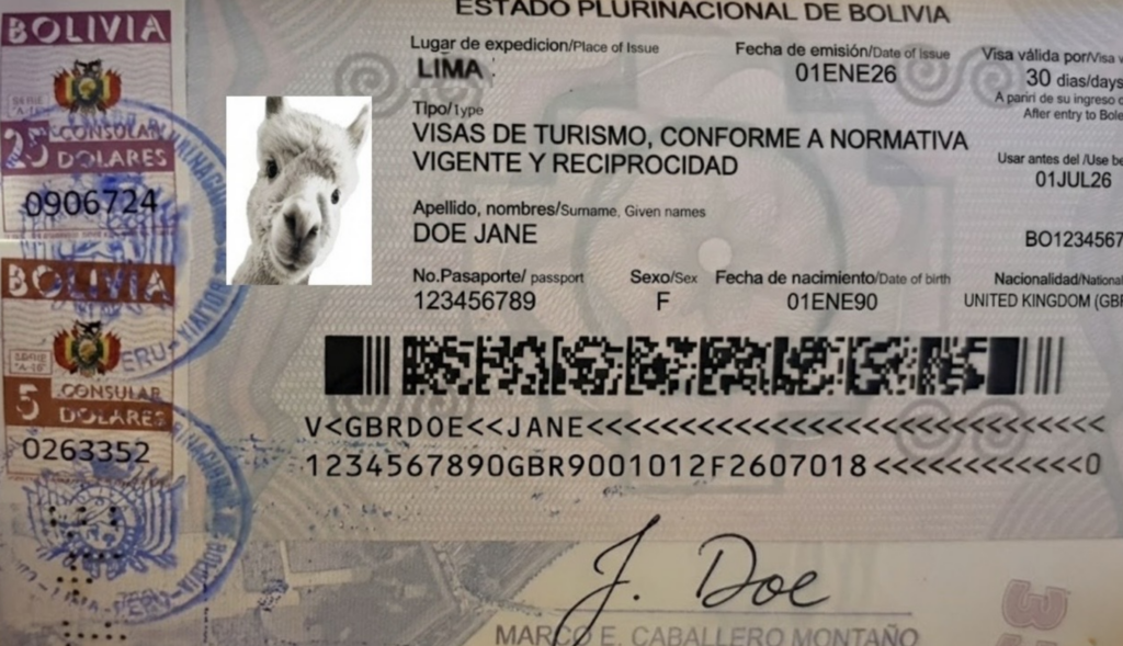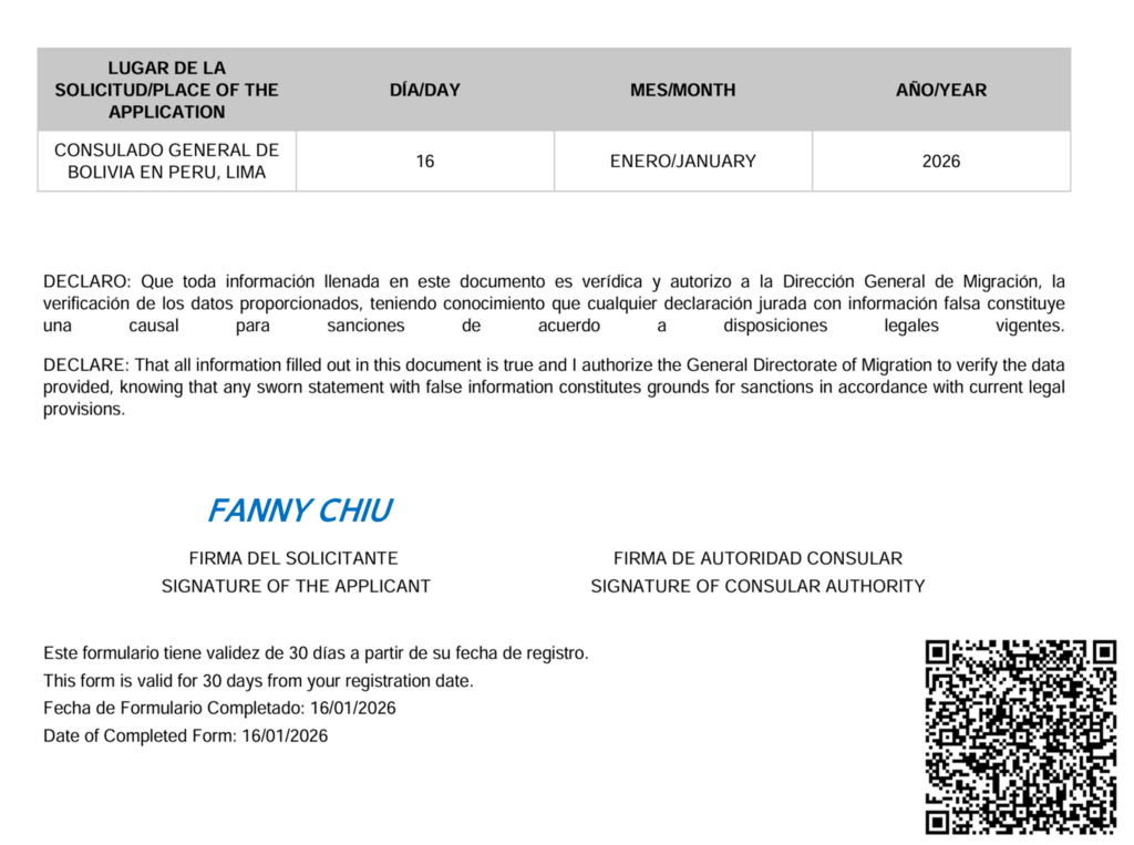 - 簽發地點 (Lugar de expedicion):LIMA。這表示簽證是在秘魯利馬的玻利維亞領事館辦理的