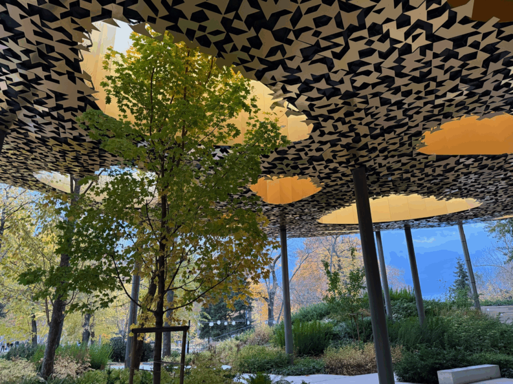 屋頂天篷下方覆蓋著超過 30,000 片金色的「葉子」裝飾,營造出如同金色音樂森林