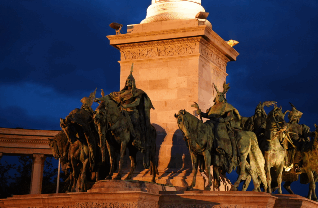 紀念碑的基座上環繞著七尊騎馬的青銅塑像,他們是以阿爾帕德大公(Árpád)為首的七位馬札爾部落領袖,正是他們在 9 世紀帶領馬札爾人定居於此地,創建了匈牙利