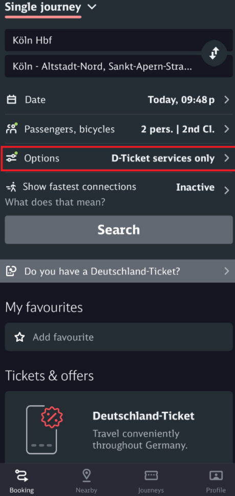 - 搭配 App 查票:在 DB Navigator App 查詢路線時,記得勾選 “D-ticket service only”,搜出來的結果就保證能用這張月票搭乘