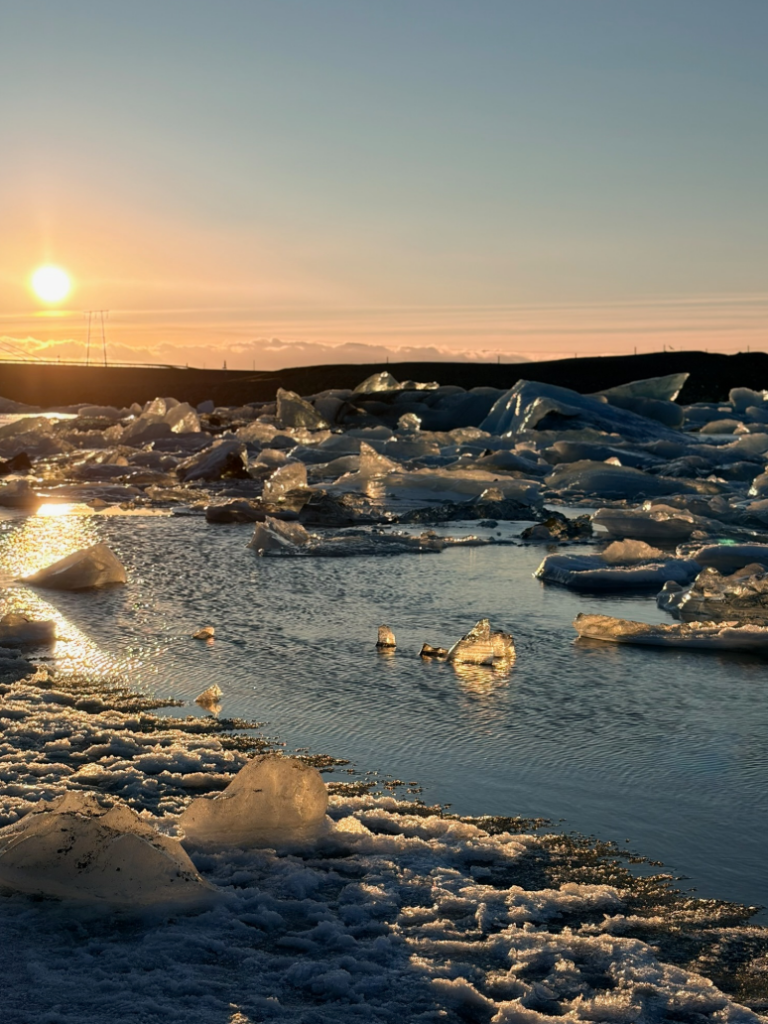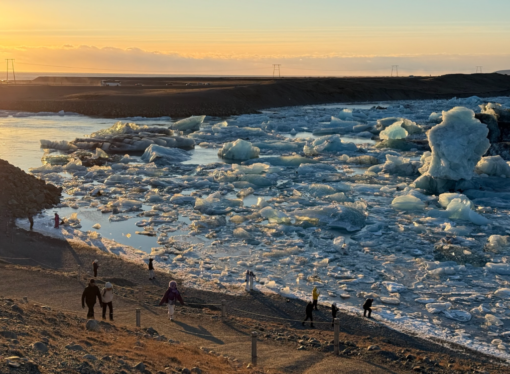 湖中的浮冰隨著水道流向大海,被北大西洋的驚濤駭浪重新拍打上岸,在陽光下閃耀著如鑽石般的光芒