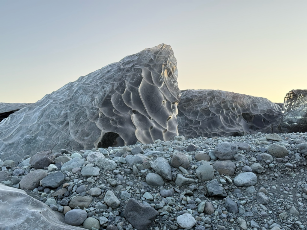 剔透的冰塊與深邃如墨的沙灘形成了強烈對比,像是無數散落的大鑽石