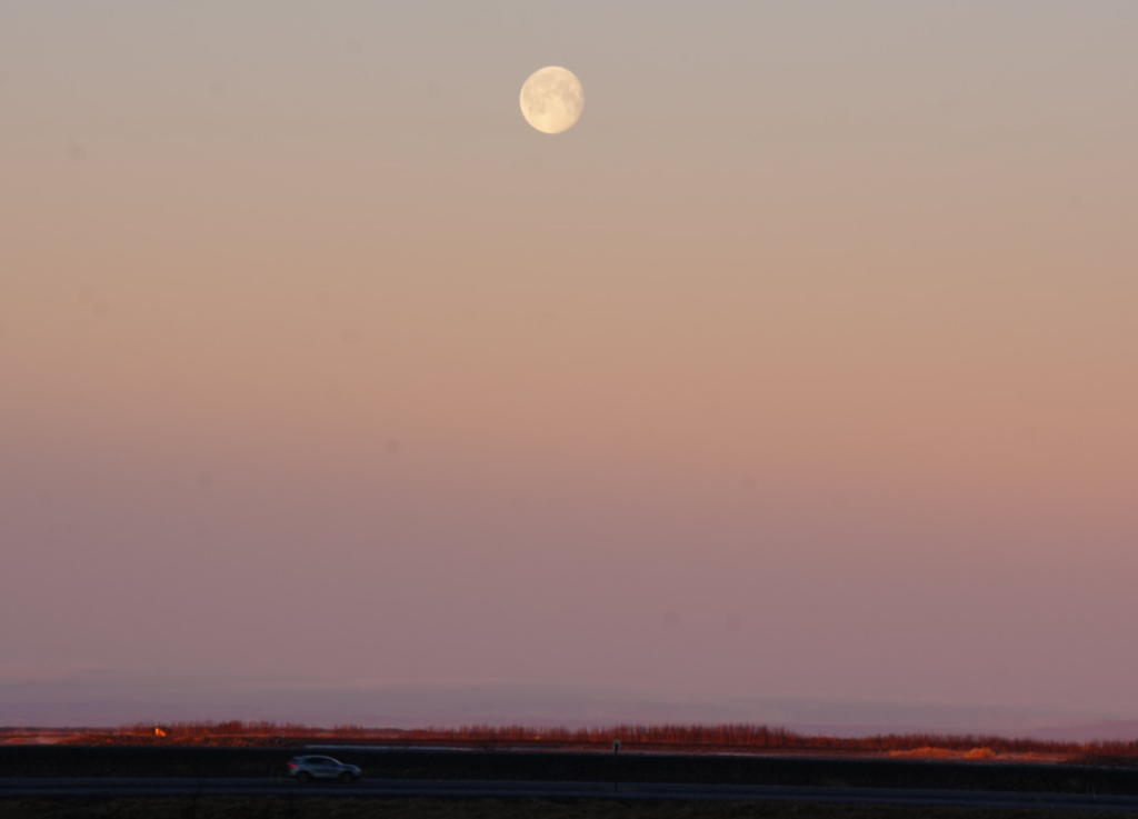 在冰島的深冬,太陽升起的高度很低,光線穿過厚厚的大氣層產生折射