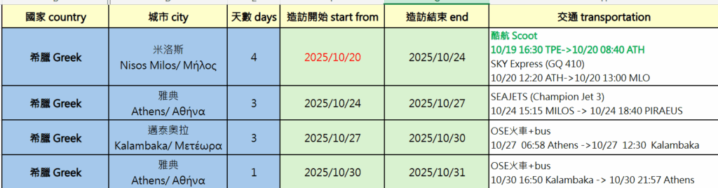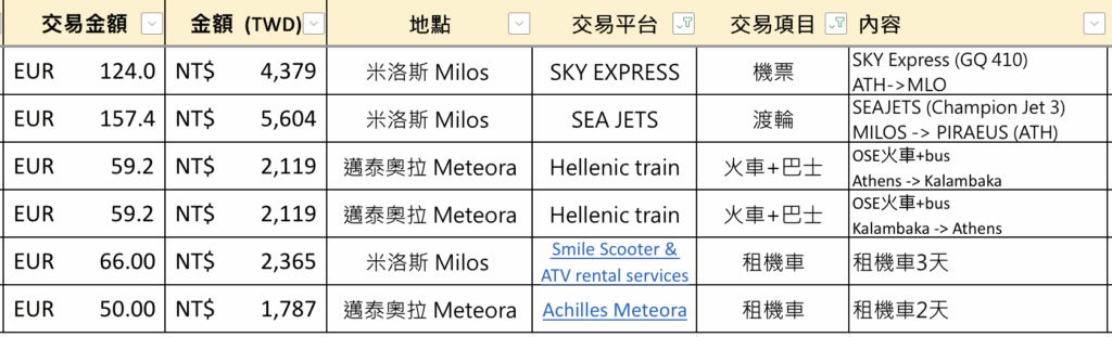 在希臘跑了三個地方所以交通費花了不少, 以下表格都是兩人的