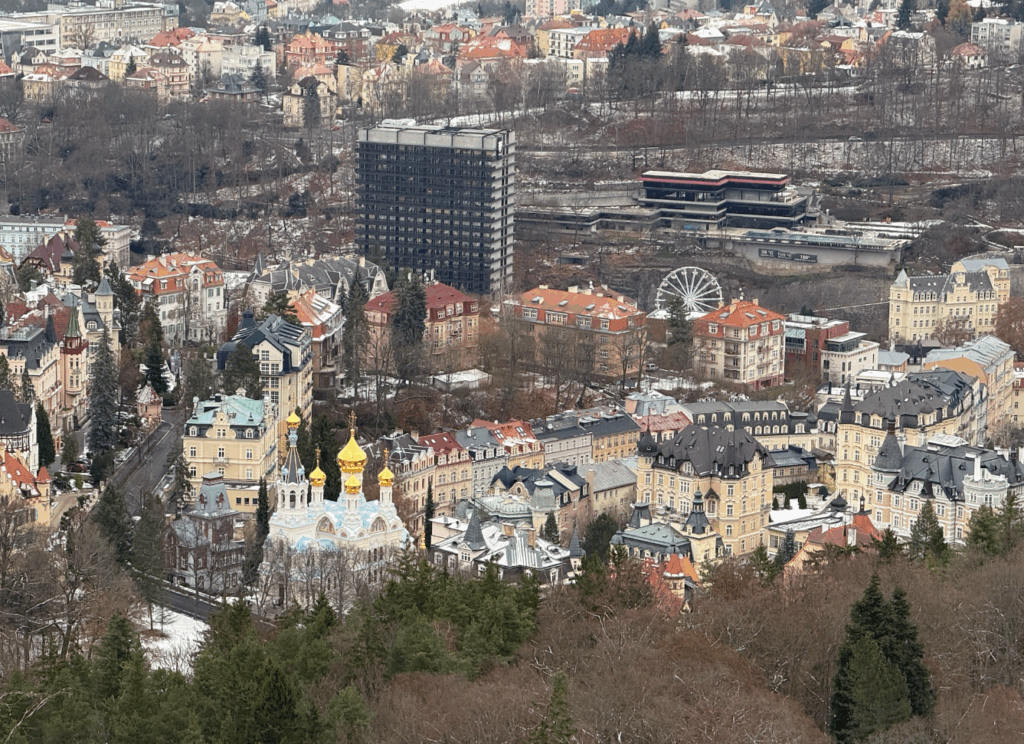 電梯門打開,整個卡羅維瓦利小鎮、蜿蜒的特普拉河、以及遠處無盡的森林,全部盡收眼底