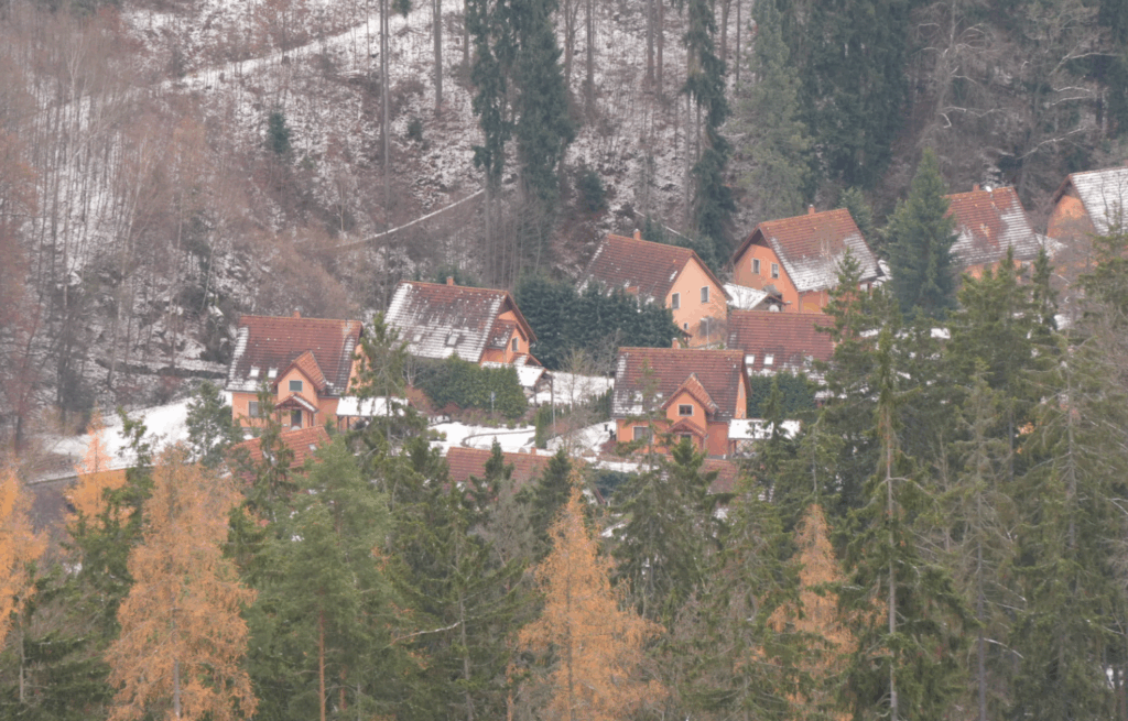 這片橙色屋頂與綠色山巒交織的美景
