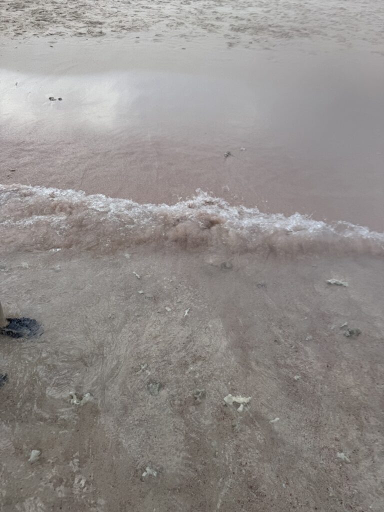 細緻的白沙中,散落著許多小小的、破碎的紅色珊瑚