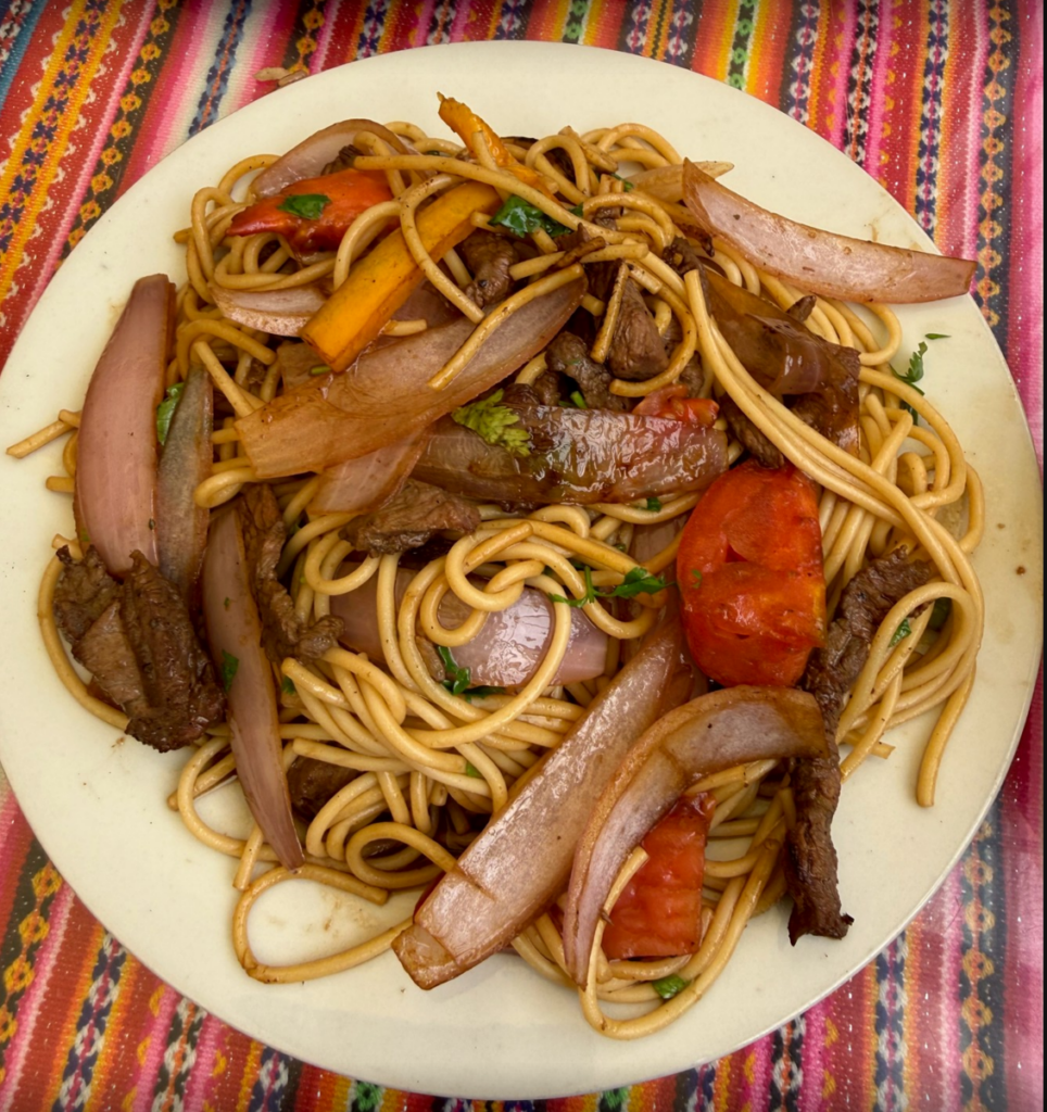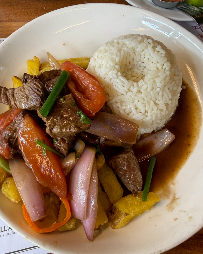 - Lomo Saltado (牛肉炒薯條): 這道菜深受亞洲移民影響,是牛肉與番茄、洋蔥和薯條的大火快炒,通常會配白飯