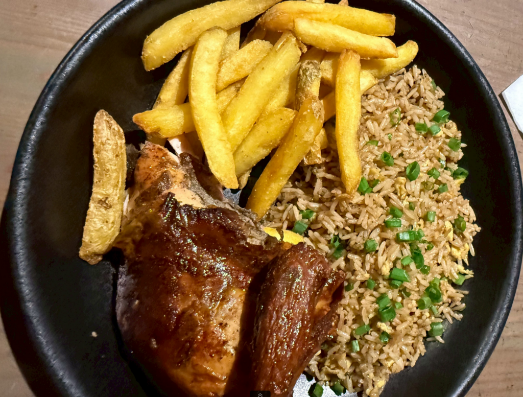 - Pollo a la Brasa(炭烤雞)烤雞 + 炒飯 + 薯條,分量極大