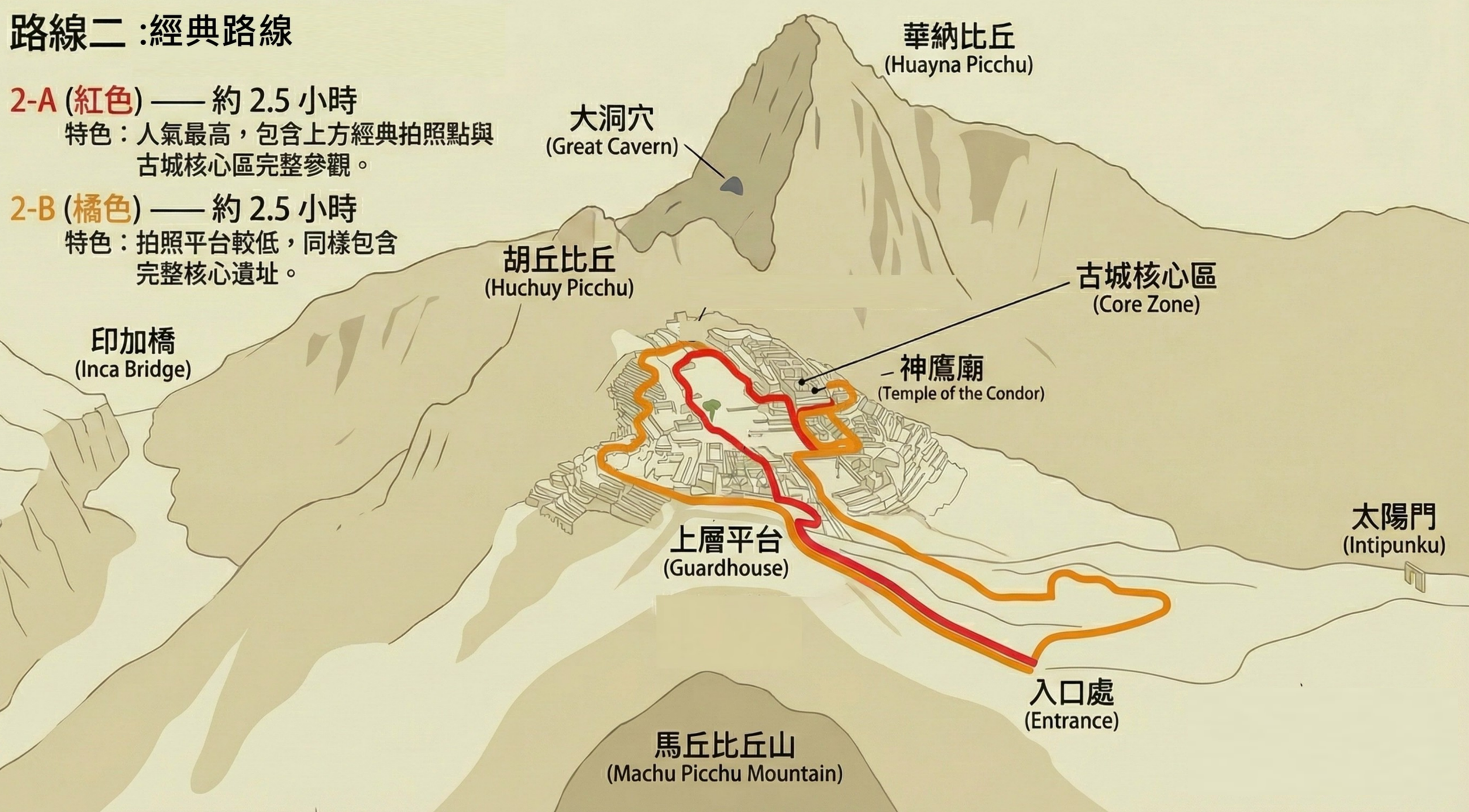 - 2-B (橘線 / 約 2.5 小時): 拍照的平台稍微低一點(下層平台),但同樣能完整參觀核心遺跡區,體驗印加帝國的歷史氛圍
