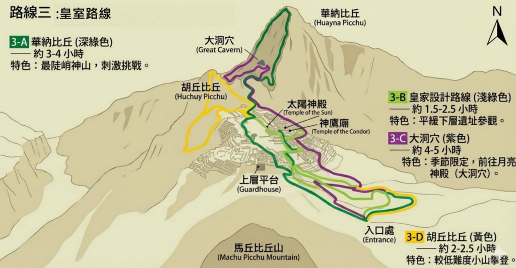 - 路線 3 皇室路線(綠色): 偏向下方遺跡與周邊兩座神山(華納比丘、胡丘比丘)的探險