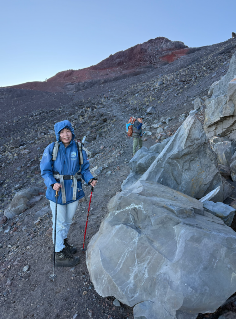 嚮導帶領我們走 Z 字型,這段路不只坡度陡升,腳下鬆散的火山碎石也是滑得要命