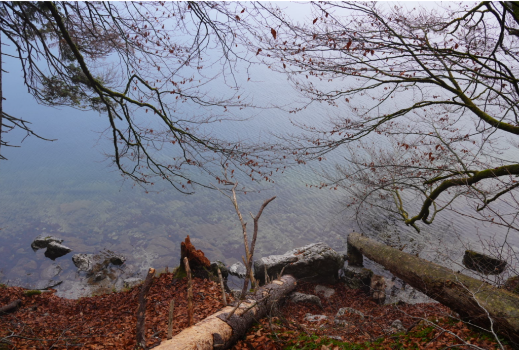雖然濃霧讓人視野受限,無法看清遠處的景致,但近處的湖水依舊清澈見底