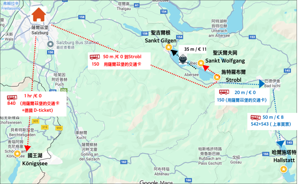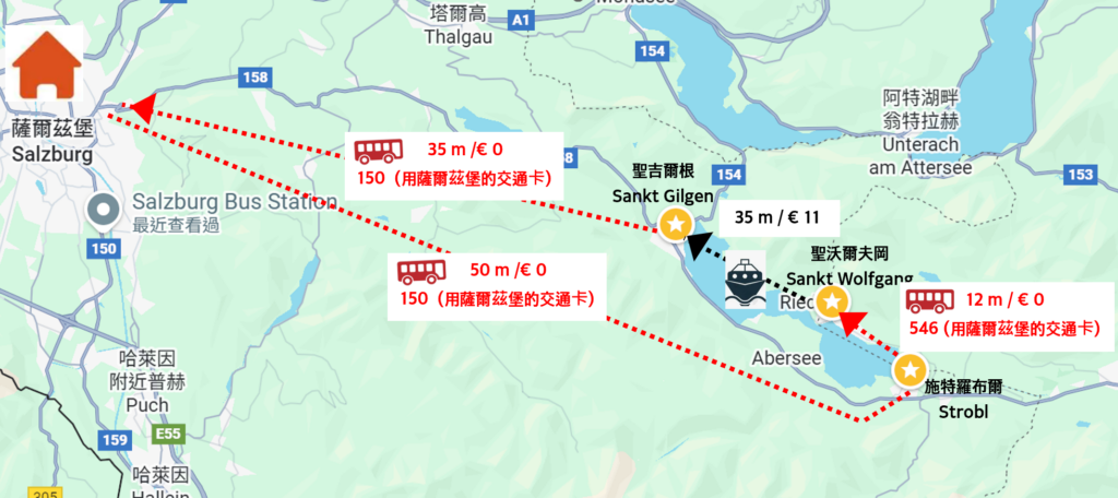 一路搭公車使用薩爾茲堡的交通卡 € 0,搭配一段遊船( St. Wolfgang–>St. Gilgen ) € 11