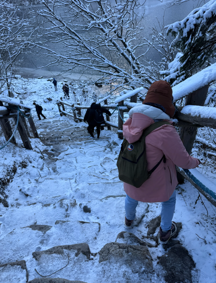 有些結冰比較嚴重,滑溜溜,讓我們不得不小心翼翼地扶著欄杆走