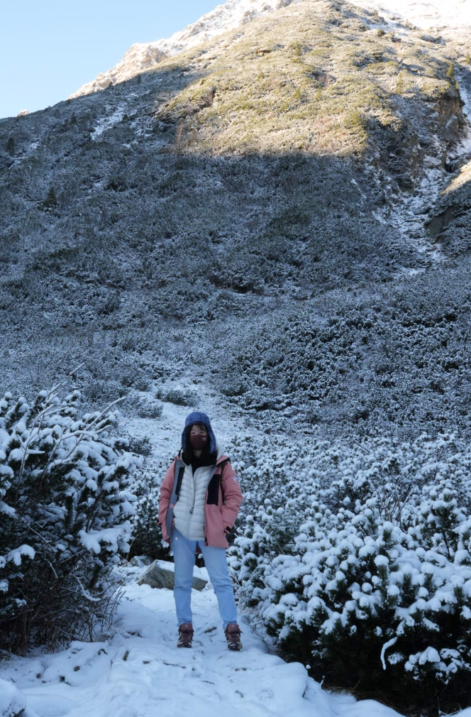 我們踩在像棉花糖般的雪地裡輕盈前行,沒有摔跤的狼狽