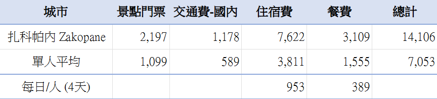 💳扎克帕內4 天總花費- TWD 7千元/人(不含跨國往返交通)